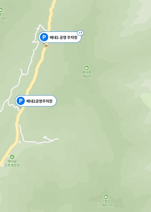 다행히 흰색 실선 구간 갓길 주차는 가능해요. 배내2 공영주차장 주변 갓길에도 차가 많아서 주차할 공간이 없다면 고려해 볼 주차장은 배내1 공영주차장이에요.
