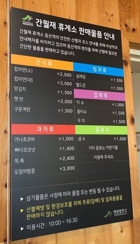 등산로가 끝나고 길이 넓어지면 화장실이 있는 대피소와 휴게소가 보여요. 간식으로 컵라면과 간단한 과자류가 있고 물, 아이스크림도 팔아요. 뜨거운 물이 있어서 일일이 챙겨 가지 않아도 돼서 간단한 간식 또는 점심을 해결하기에 좋아요.