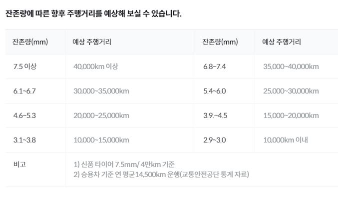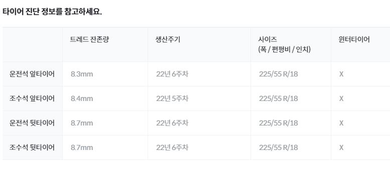 타이어 진단도 매우 상세히 기록해 두어서 중고차 구매 후 타이어를 교체할 필요가 있는지에 대해서도 판단할 수가 있습니다. 타이어 트레드 잔존량에 따른 향후 주행거리도 예상해 볼 수가 있어서 차에 대해 전혀 모르는 사람도 쉽게 파악할 수가 있습니다.