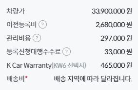 K 카는 직영으로 운영되기 때문에 관리비용이 자동차 구매가격에 포함되어 있습니다. 또한 등록신청대행 수수료도 기본 가격에 포함되어 있는 것을 알수 있습니다. 직영운영에 K 카 상세진단이 기본으로 포함되어 있어 동급대비 타 사이트에 비해 가격이 조금 높아 보입니다.