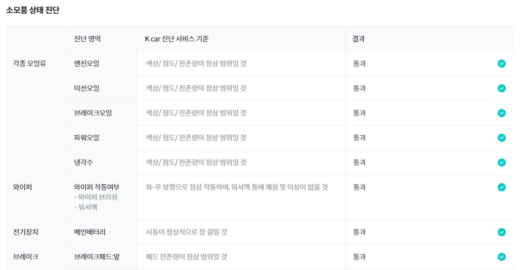 상세 진단결과에는 외부패널, 주요프레임 진단 외에 실내 및 외관, 타이어 및 휠, 소모품, 하체, 편의장치까지 차량의 대부분이 포함되어 있습니다.